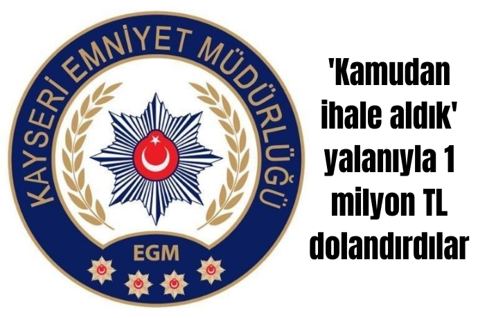 Kayseri'de 1'i kadın 2 kişi, kamudan ihale aldıkları yalanını söyleyerek, para kazanma vaadi ile bir vatandaşı 1 milyon TL dolandırdı. Polis ekipleri tarafından kimliği belirlenen kadın şüpheli, polis ekipleri tarafından yakalandı.