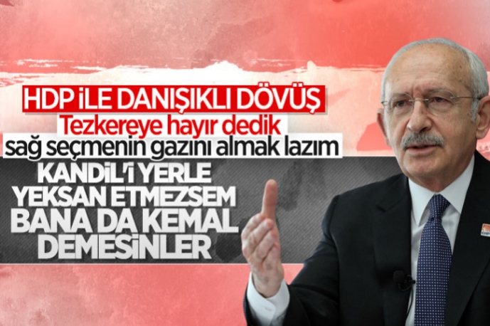 Kılıçdaroğlu, Kandil'i yerle yeksan edeceğini de sözlerine ekleyerek, "Terörle mücadeleyi bunlar gibi yapmayacağız. Söz veriyorum o Kandil denen terör yuvasını yerle yeksan etmezsem Kılıçdaroğlu demesinler. Mücadele yürek, bilek işidir." ifadelerini kullandı.