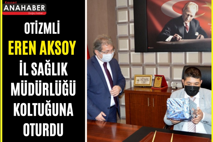 Bir süreliğine de olsa İl Sağlık Müdürlüğü makamına oturan otizmli Eren Aksoy özellikle pandemiye dikkat çekerek maske, mesafe ve temizlik uyarısı yaptı.