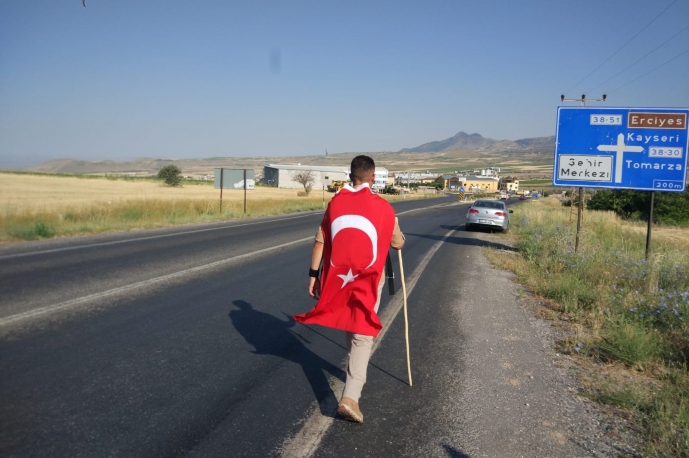 15 Temmuz hain darbe girişiminde demokrasi nöbeti için Kayseri’nin Develi ilçesine 47 kilometre uzaklıktaki Şıhlı mahallesinden gelen 45 yaşındaki Bünyamin Yurdakul, sırtındaki Türk Bayrağı ile bu yıl 47 kilometrelik yolu 4. kez yürüdü.