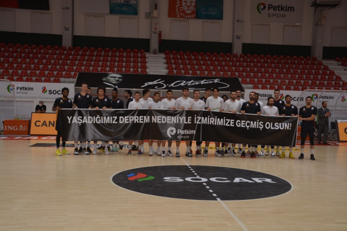 İZMİR (İHA) - ING Basketbol Süper Ligi’nin 6. haftasında Aliağa Petkim Spor, evinde konuk ettiği Galatasaray’ı 83 -64 mağlup etti. Karşılaşma öncesi her iki takım basketbolcuları 'Yaşadığımız deprem nedeniyle İzmir’e geçmiş olsun' yazılı pankartla sahaya çıktı.