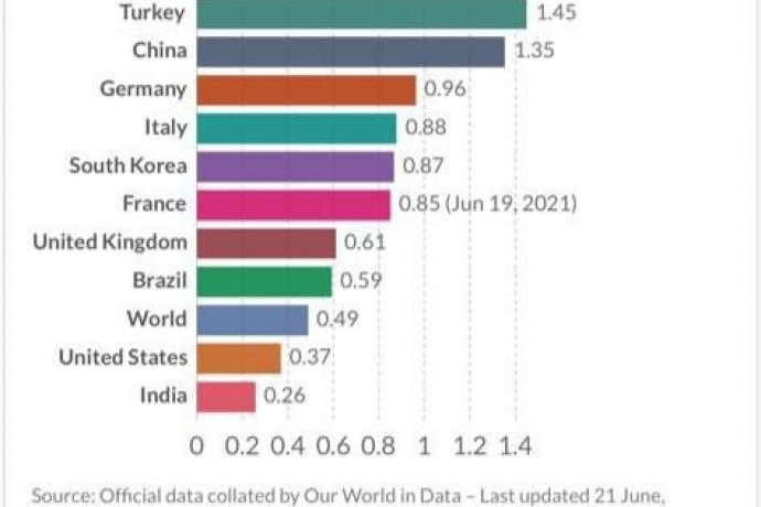 Sağlık Bakanı Fahrettin Koca sosyal medya hesabından yaptığı paylaşımda, “Aşılama hızında en iyi performans Türkiye’nin. 14-20 Haziran arasında, Türkiye, Çin ve Almanya’yı geride bırakarak, aşılama hızında en yüksek performansı gösteren ülke oldu. Her gün, aşı programındaki her 100 kişiden ortalama 1,45’inin aşısı yapıldı (Kaynak: Our World in Data)” ifadelerini kullandı.