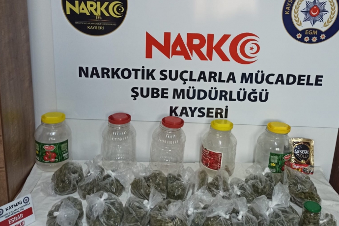 Edinilen bilgiye göre, Kayseri İl Emniyet Müdürlüğü Narkotik Suçlarla Mücadele Şube Müdürlüğü ekipleri, İ.K.'nın bağ evinden uyuşturucu madde ticareti yaptığı bilgisi üzerine şahsın adresi tespit ederek operasyon düzenledi. Bağ evinde yapılan aramada; 21 parça halinde satışa hazır vaziyette bin 950 gram kubar esrar maddesi ele geçirildi.