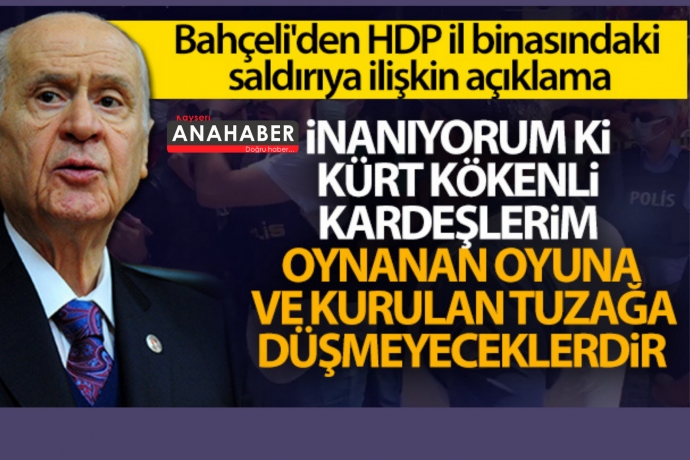 Bahçeli, “Bugünkü hassas ortamda herkesin duyarlı ve düşünceli hareket etmesi özellikle temennimdir. Sağlık çalışanıyken istifaen ayrılmış kirli şahsı gerekçe gösterip Milliyetçi-Ülkücü Hareket'i ithama tevessül etmek milli birlik ve kardeşliğe tehlikeli şekilde tahammülsüzlüktür. Milliyetçi Hareket Partisi'nin şerefli mücadelesi; hukuk, demokrasi ve siyasi ilkeleriyle sınırlıdır. Bunun dışında hiçbir alan, saha ve zeminde davamızın ve dava arkadaşlarımızın anılması, bulunması, herhangi bir çatışmanın faili olması ihtimalen bile olsa söz konusu değildir. HDP binasına saldırı emri verenler, kapalı devre faaliyet içinde olanlar, alacakaranlık ortamdan nemalananlar, el ovuşturanlar, eylemin rotasını çizenler, kamçılanan toplumsal gerginliği kırılma noktasına kadar bükmeyi amaçlayanlar tespit, teşhir ve tecziye edilmelidir. Türkiye sokakta bulunmamıştır, sokak aralarında cirit atan casus ve hainlere teslim edilmeyecektir. Milliyetçi Hareket Partisi buna yeminlidir” dedi.