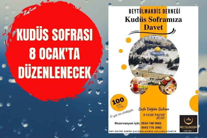 Kudüs Sofrası'na katılmak isteyenlerin 0534 748 56 62 veya 0543 776 30 83 numaralı telefonlardan rezervasyon yaptırabilecekleri duyuruldu.