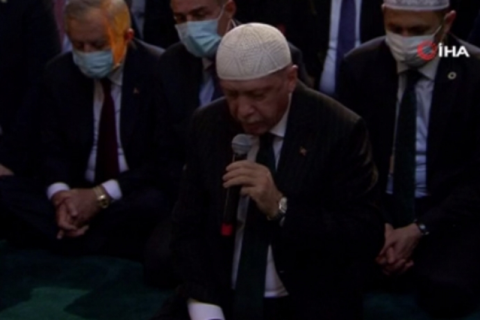 Cumhurbaşkanı Erdoğan, 86 yıl sonraki ilk namaz öncesi Kur'an-ı Kerim okudu.