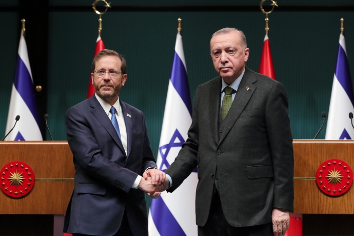 Cumhurbaşkanı Recep Tayyip Erdoğan, İsrail Cumhurbaşkanı Isaac Herzog'u Ankara'da resmi törenle karşıladı. Erdoğan ve Herzog görüşmenin ardından ortak basın açıklaması gerçekleştirdi. İsrail Devlet Başkanı Herzog’u Türkiye'de ağırlamaktan memnuniyet duyduğunu ifade eden Erdoğan, "Bu tarihi ziyaretin Türkiye-İsrail ilişkilerinde yeni bir dönüm noktası olacağına inanıyorum. Müşterek hedefimiz, ülkelerimiz arasında ortak çıkarlara dayalı karşılıklı hassasiyetlere uygun şekilde Türkiye- İsrail ilişkilerinin gelişmesi ve güçlenmesi ülkelerimiz açısından olduğu kadar bölgesel istikrar açısından da önemli" dedi. Erdoğan, "Birlikte yaşama kültürüne yeniden katlı sağlamak bizim elimizdedir. Pozitif bir gündem içinde ikili işbirliği ve bölgesel İşbirliği potansiyelini hayata geçirmemiz özellikle önem taşıyor. Ticaret hacmimiz salgına rağmen yüzde 36’ya yakın bir artış göstererek geçtiğimiz sene 8 buçuk milyar dolar seviyesine ulaşmıştır. Ortak çabalarımızla bu rakamı 2022 senesinde 10 milyar dolara taşıyacağımıza inanıyorum" açıklamasında bulundu.