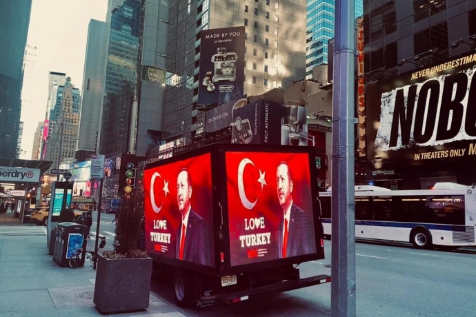 ABD'nin New York kentinde bulunan Times Meydanı'nda geçtiğimiz günlerde verilen "Stop Erdogan" yazılı ilanının ardından bu kez "Love Erdogan" yazılı dijital ekranlı kamyonet dolaştırıldı. Kamyonetin dijital ekranında Türk bayrağı ve Cumhurbaşkanı Recep Tayyip Erdoğan'ın fotoğrafı da yer alırken, hoparlörlerden Dombra da çalındı.