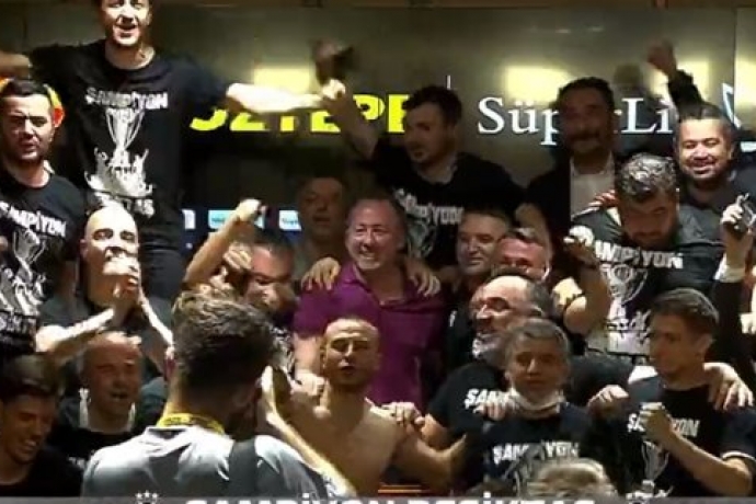 İZMİR (İHA) - Göztepe deplasmanında 2-1 kazanarak şampiyonluğunu ilan eden Beşiktaş'ta futbolcular, Teknik Direktör Sergen Yalçın'ın basın toplantısını basarak kutlama yaptı.
