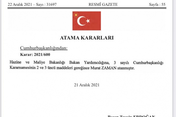 Cumhurbaşkanlığı atama kararı, 22 Aralık 2021 tarihinde yayımlanan Resmi Gazete’de yayımlandı. Hazine ve Maliye Bakanlığı görevine Murat Zaman’ın atandığı duyuruldu.