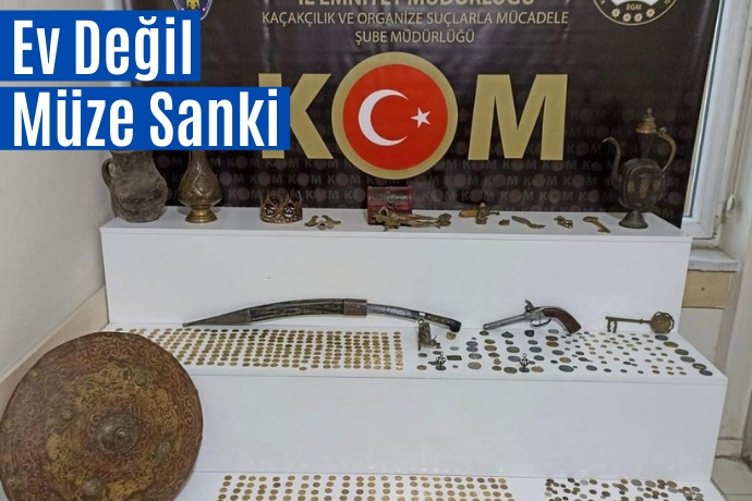 Kaçakçılık ve Organize Suçlarla Mücadele Şube ekipleri tarafından yapılan çalışmalar sonucu bir ikamete yapılan operasyonda 603 adet Bizans ve Roma dönemlerine ait olduğu değerlendirilen altın ve gümüş sikke, 1 adet tarihi eser niteliği taşıyan tabanca, 1 adet kılıç, 1 adet metal işlemeli kalkan, 8 adet çeşitli dönemlere ait üzerlerinde değişik figür ve yazılar bulunan heykel, vazo ve çömlek, 2 adet mühür, 1 adet üzerinde çeşitli figürler bulunan insan heykeli ve 1 adet üzerinde çeşitli figürler bulunan hayvan heykeli bulundu.