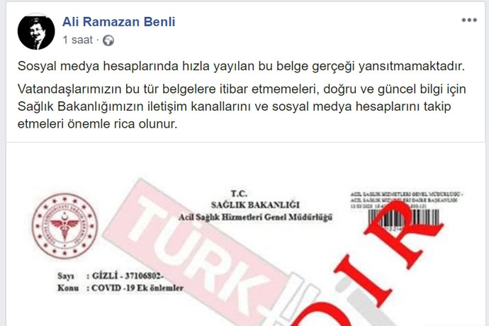 Kayseri İl Sağlık Müdürü Doç. Dr. Ali Ramazan Benli, ülkemizi koronavürüs üzerinden kaosa ve infiale sürüklemek amaçlı hazırlanarak sosyal medya mecralarına servis edilen, “Covid-19 Ek Önlemler” konulu belgenin asılsız bilgiler içerdiğini ve gerçeği yansıtmadığını, sosyal medya hesabı üzerinden yaptığı paylaşım ile duyurdu.