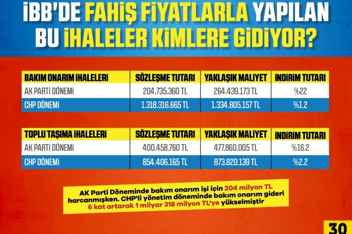 “Bizim dönemimizde yıllık 400 milyon TL olan toplu taşıma işi Yenikapı'da araç şovu yapan bu yönetim döneminde yüzde 100'den fazla artarak 854 milyon TL'ye yükselmiştir. Benzer şekilde bizim dönemimizde yıllık 204 Milyon TL bakım onarım gideri yapılırken bu yönetim döneminde 6 kattan fazla artarak 1 Milyar 318 Milyon TL'ye yükselmiştir. Önemli bir husus da şudur ki, bizim dönemimizde ihaleler yaklaşık maliyet üzerinden yüzde 20 civarında indirimle yapılırken bu yönetim döneminde sadece yüzde 1-2 indirimle gerçekleştirilmektedir. Alt yüklenici tarafından 4 milyona yapılan bir işi, İBB 32 milyon TL’ye ihale ederek 28 Milyon TL zarara uğratmıştır. İstanbullunun parası her geçen gün hoyratça harcanmaktadır. İBB bünyesinde koordinatörlük yapan birinin firmasına milyonluk ihaleler verilmiştir. AK Parti döneminde 7 liraya alınmış bir ekmek arası kaşar 29 lira gibi fahiş bir rakama satın alınmıştır. Bunlar gibi onlarca şaibeli ve usulsüz ihale orta yere saçılmaktadır.”
