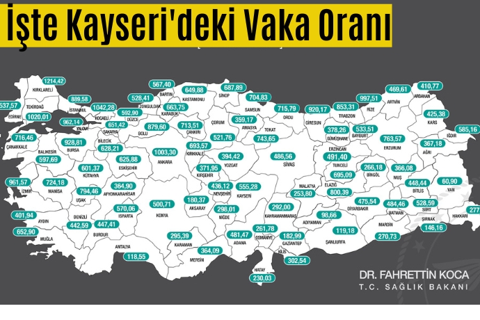 Sağlık Bakanlığı'nın açıkladığı verilere göre Kayseri'de 100 bin kişide yeni Cocvid-19 vaka sayısı 555.28 olarak duyuruldu.