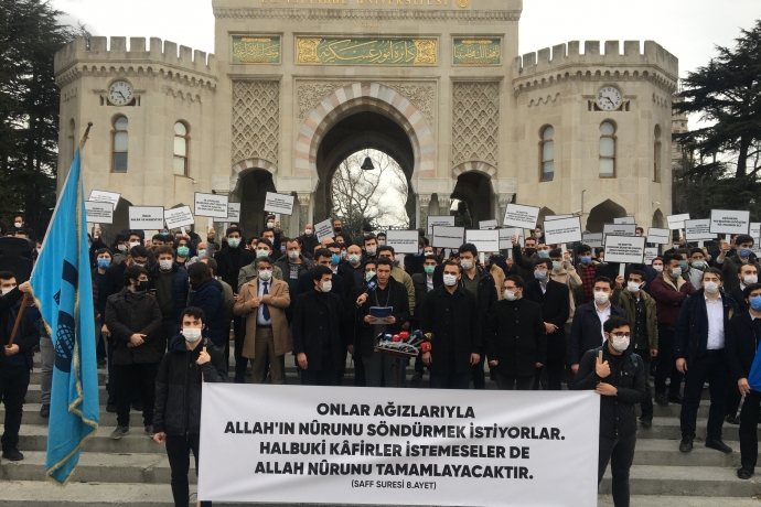 Anadolu Gençlik Derneği ve Milli Gençlik Vakfı üyeleri, ikindi namazının ardından Beyazıt Meydanı'nda toplandı. Grup üyeleri, basın açıklaması öncesinde Saff Suresi'nin 8. ayeti olan “Onlar ağızlarıyla Allah'ın nurunu söndürmek istiyorlar. Halbuki kafirler istemeseler de Allah nurunu tamamlayacak” yazılı pankartı açtı. Boğaziçi Üniversitesi’ndeki sergide Kabe fotoğrafının yere serilmesi tekbirlerle protesto edildi. Kur'an-ı Kerim tilavetinin okunmasının ardından basın açıklamasına geçildi. Düzenlenen eyleme çok sayıda sivil toplum kuruluşu ve siyasi parti de destek verdi.