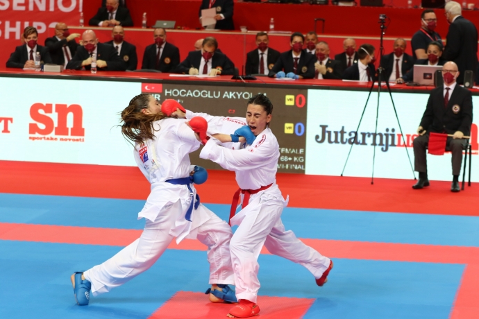 Kadınlar kumite +68 kiloda Meltem Hocaoğlu Akyol, Porec’te çifte mutluluk yaşadı. Avrupa Karate Şampiyonası’nda finale yükselen Akyol, kazandığı kota puanlarıyla Tokyo Olimpiyatları’na katılmayı garantiledi. İlk turda Portekizli Ana Rita Oliveira’yı 3-0, ikinci turda İsviçreli Ramona Bruederlin’i 2-1 mağlup eden Akyol çeyrek finalde de Rus Vera Kovaleva’yı hakem kararıyla 5-0 yenmeyi başardı. Yarı finalde çekişmeli maçta İtalyan Clio Ferracuti’yi 5-4 mağlup eden Meltem Hocaoğlu Akyol, Avrupa Şampiyonası’nda üçüncü kez finale çıktı. 2015 ve 2017 yıllarında Avrupa ikincisi olan Akyol, kariyerinin ilk Avrupa şampiyonluğu için Aleksandra Stubleava ile karşılaşacak.