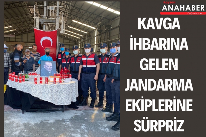 Kayseri'de bir fabrika çalışanları, kavga ihbarı yaparak çağırdıkları jandarma ekiplerine pastalı sürpriz yaptı.