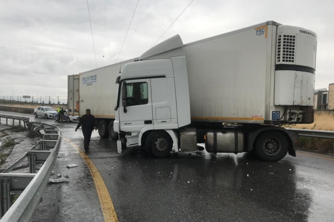 Kayseri’de yağmur yağışı ile kayganlaşan yolda makas kesen tır, kaza yaptı.