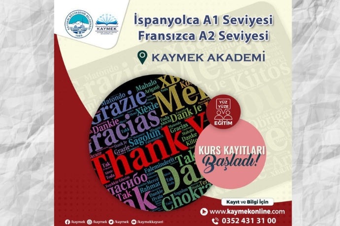 Kayseri Büyükşehir Belediyesi bünyesinde faaliyet gösteren Kayseri Mesleki Eğitim ve Kültür A.Ş. (KAYMEK), yabancı dil öğretmek ve kaliteli bir eğitim sunmak amacıyla İspanyolca ve Fransızca dersleri verecek. Buna göre KAYMEK Akademi’de yabancı dil öğrenmek isteyenler için yabancı dil kurs kayıtları başladı.