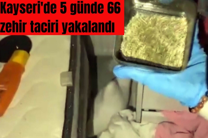 Kayseri İl Emniyet Müdürlüğü Narkotik Suçlarla Mücadele Şube Müdürlüğü ekiplerince son 5 günde yapılan çalışmalarda uyuşturucu madde ticareti yaptığı belirlenen 66 kişi gözaltına alındı.