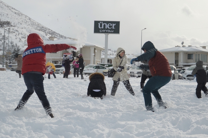 Renkli görüntülerin ortaya çıktığı etkinliği organize edenlerden Murat Bıyık, kar yağışını eğlenceli bir şekilde değerlendirmek istediklerini belirterek "Yaklaşık 60-70 kişi var. Buraya gelerek kar topu savaşına katılan ve kardan adam yapanlar var. Aile sıcaklığında etkinlik oldu." diye konuştu.