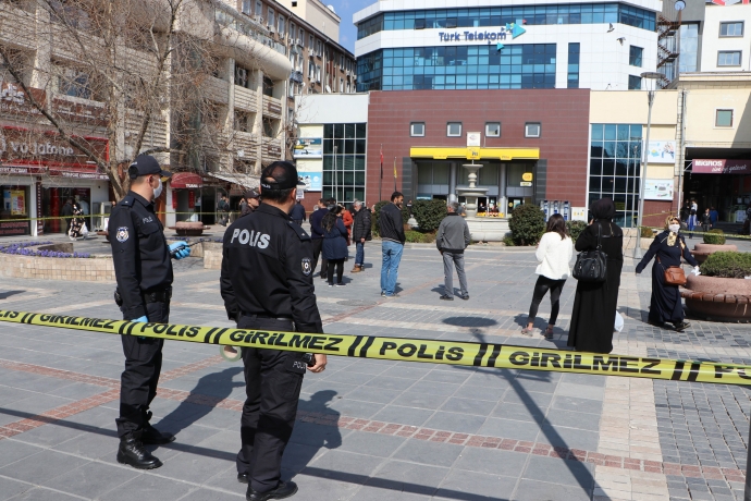 Ekipler ayrıca, vatandaşları bilgilendirmek için de sık sık uyarılarda bulundu. PTT önünde kalabalık önlenmesi için de şerit çekildi.