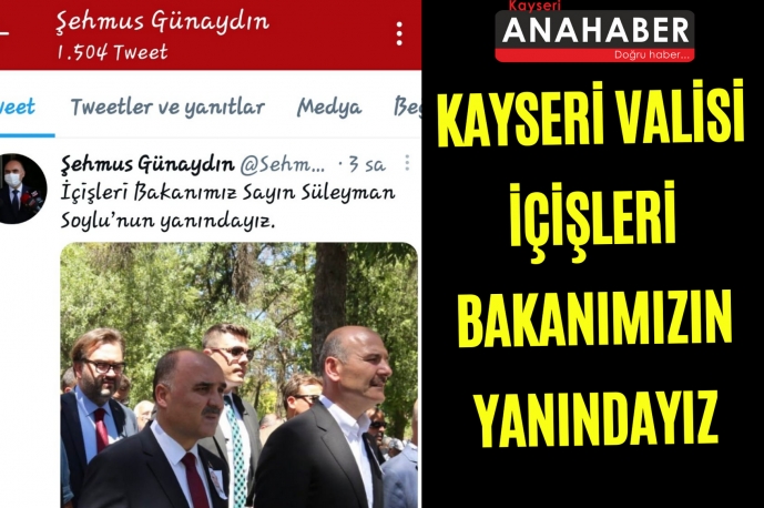 Kayseri Valisi Şehmus Günaydın, yeraltı dünyasının önemli ismi Sedat Peker'in yayınladığı videolarında hedef aldığı İçişleri Bakanı Süleyman Soylu' nun resmini paylaşarak 'İçişleri Bakanımız Süleyman Soylu'nun yanındayız' mesajını paylaştı.