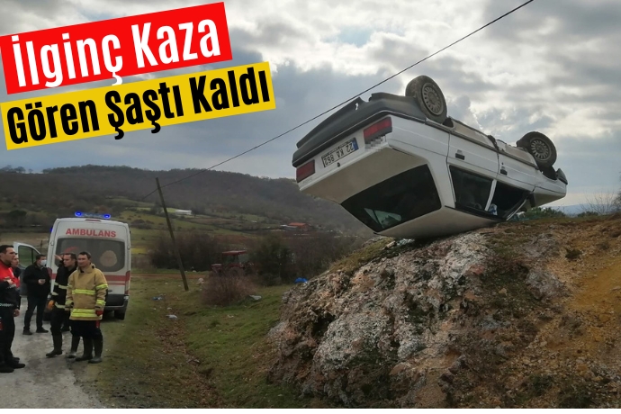 Direksiyon hakimiyeti kaybolan araç 2 metre yüksekliğindeki taşın üzerine çıkarak takla attı.