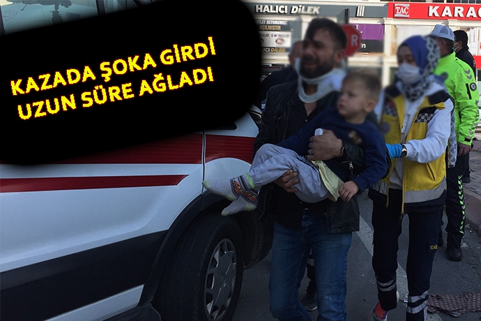 Kayseri'de iki aracın kavşakta çarpıştığı kazada 6 kişi yaralandı. Yaralılardan biri şoka girerken kucağında tuttuğu çocukla birlikte uzun süre ağladı.