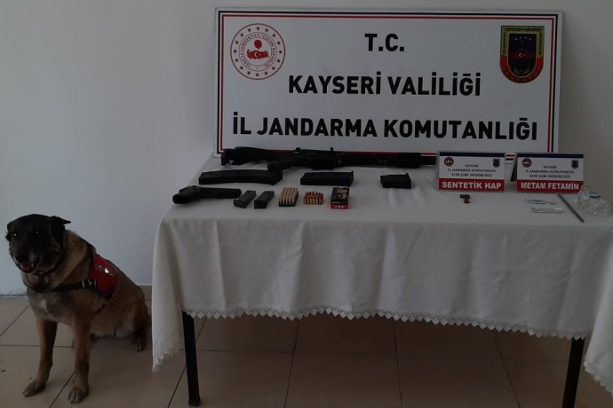Edinilen bilgiye göre jandarma ekiplerince Talas ilçesi Malatya karayolu üzerinde kazaya karışan bir araçta arama yapıldı. Yapılan aramalarda O.A. ve E.A.'ya ait olduğu tespit edilen 5 gram metamfetamin, 10 adet uyuşturucu hap, 1 adet 9 mm tabanca, 1 adet av tüfeği, 79 adet 9 mm fişek ve 5 adet şarjör ele geçirildi. Olayla ilgili O.A. ve E.A.'nın hastanedeki tedavilerinin devam ettiği öğrenildi.