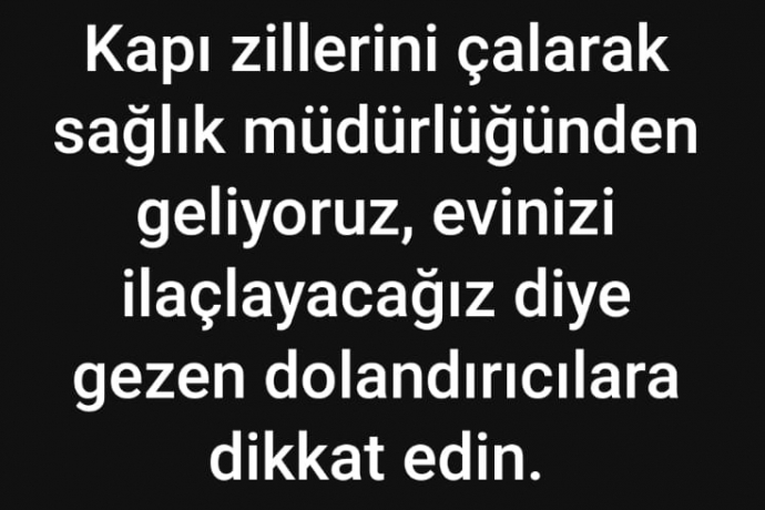 DİKKAT 10 dakika önce kapı çaldı ve kimsiniz diye sorduğumda, Sağlık Bakanlığı’ndan tarama yapmak için geldiklerini söylediler. Ne taraması dedim ve Corona için dediler. Bende istemiyorum dedim kapattım kapıyı. Ardından Sağlık Bakanlığı’nı aradım (184 SABİM) ve böyle bir hizmetleri var mı diye sordum. Telefon numaramı aldılar ve bakanlıktan dönüş yapılacağını söylediler. Dönüş yaptılar ve sabahtan beri 100’ün üzerinde ihbar aldıklarını ve hırsızların ev sahiplerini spreyle bayıltarak evleri soyduklarını söyledi ilgili kişi. Dikkat edelim lütfen.
