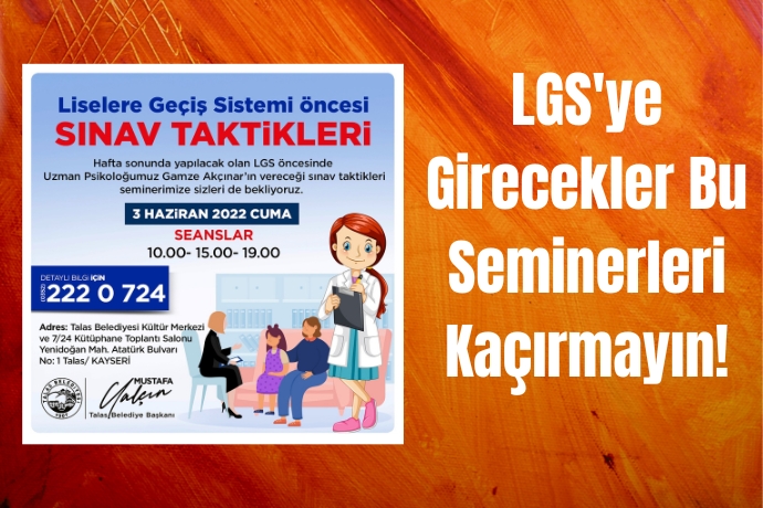 Talas Belediyesi Personeli Uzman Psikolog Gamze Akçınar tarafından verilecek olan seminerde, 5 Haziran’da yapılacak LGS öncesi motivasyon ve sınav esnasında stres yönetimi konuları anlatılacak. 3 Haziran Cuma günü Kültür Merkezi ve 7/24 Kütüphane Toplantı Salonu’nda yapılacak olan seminer, 10.00, 15.00 ve 19.00 saatlerinde 3 seans şeklinde gerçekleşecek.