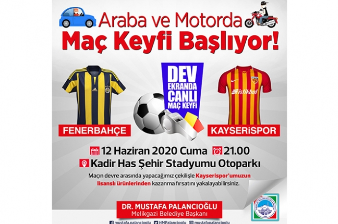 12 Haziran Cuma günü saat 21.00'de Kadir Has Stadyumu otoparkında gerçekleşecek olan etkinlikte 2019-2020 Cemil Usta Sezonu 27. hafta maçlarından Kayserispor - Fenerbahçe karşılaşması izlenecek. Otopark içerisinde gerçekleştirilecek etkinliğe araçları ile gelen vatandaşlar, kurulan dev ekranın önüne araçlarını park ederek maç keyfi yaşayacak.