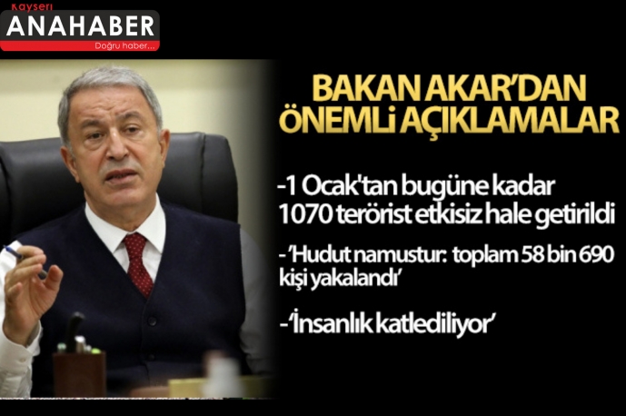 Terörle mücadelenin en son terörist etkisiz hale getirilinceye kadar devam edeceğini bir kez daha vurgulayan Akar, "Faaliyetlerimizin ne kadar yoğun ve etkili olduğunun açıkça anlaşılması bakımından önemli bir gösterge olduğu için açıklıyorum. 1 Ocak'tan bugüne kadar 1070 terörist etkisiz hale getirildi" açıklamasında bulundu.