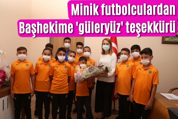 Minik futbolcular Başhekim Yasemin Doğan’a çiçek takdim etti. Başhekim Doğan, ziyaretten memnuniyet duyduğunu söyledi.
