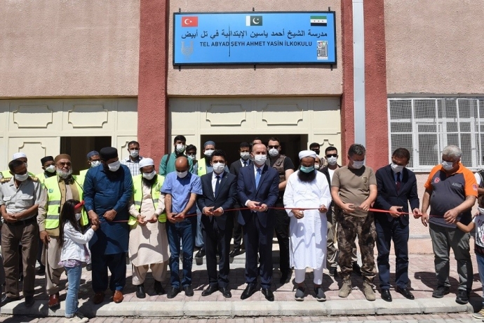 ŞANLIURFA (İHA) - Şanlıurfa Valisi Abdullah Erin’in, Barış Pınarı bölgesindeki insanlara destek olmaları için uluslararası yardım kuruluşlarına yaptığı çağrının ardından Şanlıurfa’ya bir heyet gönderen Pakistan Beytüsselam İnsani Yardım Derneğinin Telabyad’da onarım ve tefrişat işlerini yaptığı Şeyh Ahmet Yasin İlkokulu, düzenlenen törenle eğitim öğretimin hizmetine sunuldu.