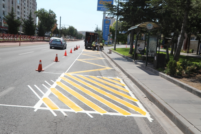 Talas Belediyesi, güvenli trafik akışı oluşturmak ve toplu taşıma araçlarına hareket kolaylığı sağlamak amacıyla yaya geçitlerine ve otobüs duraklarına uyarı çizgileri çekti.