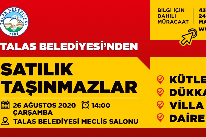 Mülkiyeti Talas Belediyesi’ne ait taşınmazlar, düzenlenecek açık artırma ihale ile satışa çıkartılacak.