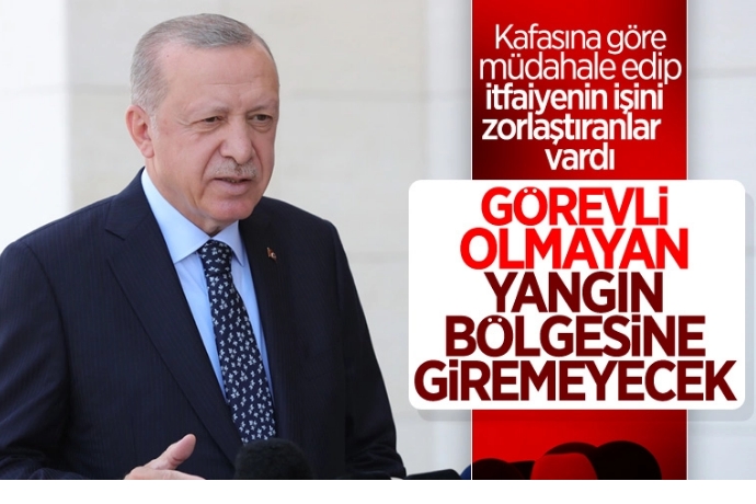 Erdoğan, ""44 ilimizde çıkan 208 orman yangınının 196'sı kontrol altına alınmış vaziyette. Orman yangınlarıyla mücadele için tüm imkanlarımızı seferber etmiş durumdayız. Ukrayna'dan gelen gece söndürme kabiliyeti olan 5 helikopter var. 24 saat full çalışacak. 5 ilimizdeki 12 yangının kontrol altına alma çalışmaları devam ediyor. Bu illerimiz Antalya, Muğla, Isparta, Aydın ve Denizli. Yangın mahalline görevli olmayanlar bundan böyle kesinlikle alınmayacaktır. Çünkü bu işi bilmeyenler başımıza daha büyük sıkıntılar çıkarabilir. İlham Aliyev'le görüştüm. Şu an itibarıyla 600'ü aşkın yetişmiş itfaiyeci göndermiş durumdalar. Bunu biraz daha da artırabiliriz diyorlar. Ülkemizi asla çöle teslim etmeyeceğiz, kurak bırakmayacağız. Bugün itibariyle 4 uçak bir helikopter daha yangınla mücadeleye katılacaktır."