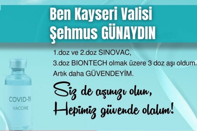 Kayseri Valisi Şehmus Günaydın resmi Twitter hesabından yaptığı paylaşımda “Ben Kayseri Valisi Şehmus Günaydın. 1.doz ve 2.doz Sınovac, 3. Bıontech olmak üzere 3 doz aşı oldum. Artık daha güvendeyim. Sizde aşınızı olun daha güvende olalım” ifadelerini kullandı.