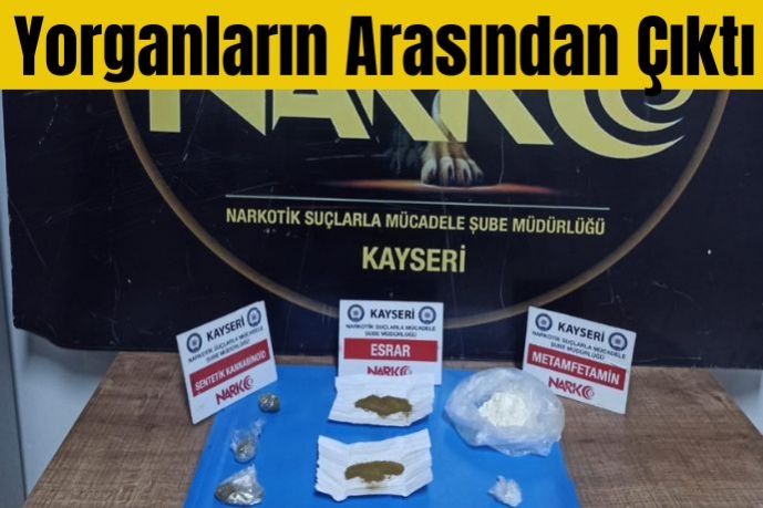 Edinilen bilgiye göre, Kayseri İl Emniyet Müdürlüğü Narkotik Şube Müdürlüğü ekipleri, Develi ilçesine Batı illerinden uyuşturucu madde getirileceği bilgisi üzerine harekete geçti. Şüphelilerin aracını tespit eden ekipler narkotik köpeği ile arama yaptı. Yapılan aramada yorganın içerisine gizlenmiş 51.58 gram metamfetamin, 2.81 gram Bonzai, 4.07 gram kubar esrar ve 6.66 gram toz esrar maddesi ele geçirildi.