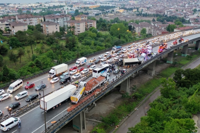Kaza, 04.45 sıralarında İzmit TEM Otoyolu Şirintepe Viyadüğü İstanbul istikameti üzerinde meydana geldi. Edinilen bilgiye göre, yol üzerinde seyir halinde olan giyim malzemesi yüklü bir tır, sürücüsünün direksiyon hakimiyetini kaybetmesi sonucu makaslayarak yan döndü. Yağmur sonrası kayganlaşan zeminde makaslayan tırın ardından gelen yolcu otobüsü ve tırların da olduğu 20'den fazla araç ise birbirine girdi, yaklaşık 15 kişi de yaralandı. Kazayı görenlerin ihbarı üzerine olay yerine çok sayıda ambulans, itfaiye ve polis ekibi sevk edildi. Olay yerine gelen itfaiye ekipleri sıkışan tır sürücüsünü kurtarmak için çalışma başlatırken, sağlık ekipleri ise yaralılara ilk müdahaleyi olay yerinde yaptı. Daha sonra ise yaralılar, ambulansa alınarak çeşitli hastanelere kaldırıldı. Kaza sebebiyle kapanan TEM Otoyolu İstanbul istikametinde ise uzun araç kuyrukları oluştu. Kaza sonrasında, kazaya karışan araçların taşıdığı ve viyadükten düşerek yola saçılan malzemeleri polis ekipleri topladı. Öte yandan feci kaza ve oluşan uzun araç kuyruğu havadan görüntülendi. Ekiplerin çalışmalarının devam ettiği öğrenildi.
